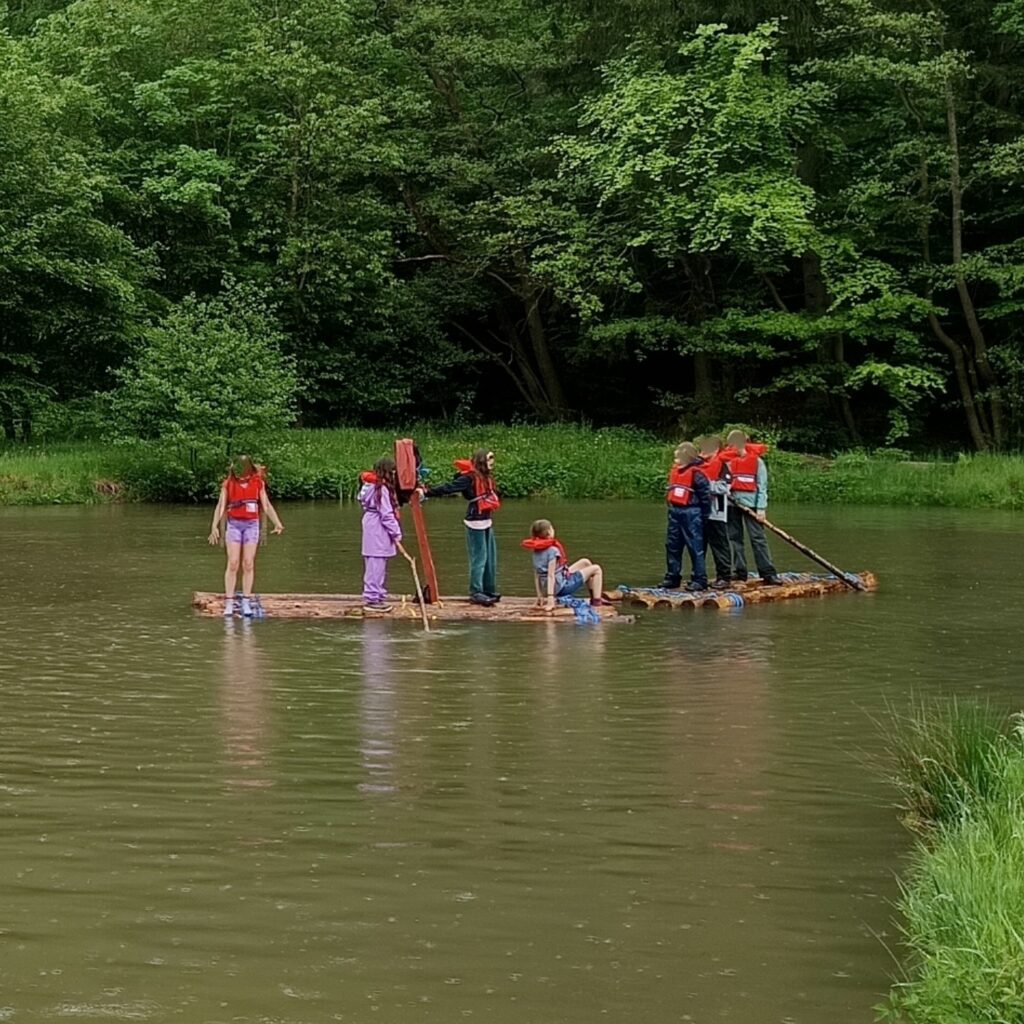 Die Klasse arbeitet sich gemeinsam durch die Stationen „Floßbau“, „Schindelmacher“, „Vermessung“, „Kunst“ und „Lokführer & Sicherheit“. Jede Station eröffnet einen eigenen Zugang zu Themen wie Nachhaltigkeit, traditionellem Handwerk, Geometrie, Kreativität und moderner Mobilität.