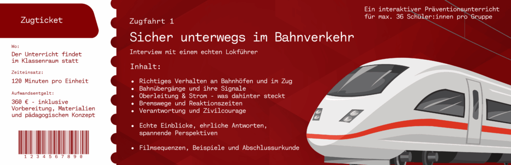 Als Lokführer beantworte, erkläre und zeige ich anhand echter Situationen, warum richtiges Verhalten im Bahnumfeld so wichtig ist. So entsteht ein lebendiger Unterricht, der Technik, Verantwortung und Menschlichkeit miteinander verbindet – authentisch, praxisnah und mit spürbarem Mehrwert für jede Altersstufe.