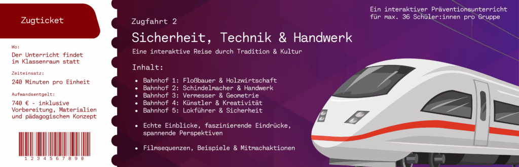 Diese interaktive Lernreise lädt Schüler:innen dazu ein, Bahn- und Verkehrssicherheit auf eine neue, erlebnisorientierte Weise zu begreifen. Die Zugreise verbindet Einblicke aus dem Bahnbetrieb mit praktischen Erfahrungen aus Umwelt, Handwerk, Kunst und Technik – altersgerecht, verständlich und mit klarem Bezug zur Lebenswelt der Kinder und Jugendlichen.